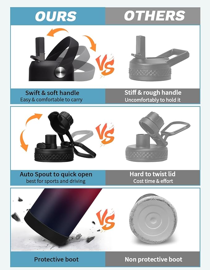• DRINK WATER ON YOUR WAY:This stainless steel water bottle includes 2 leak-proof lids - 1 straw lid and 1 auto-spout lid - to meet your different drinking needs. The pop-up spout lid is designed for one-handed opening and closing, with a large water outlet for fast drinking. The spill-proof straw lid makes it easy to sip on the go, great for all your outdoor adventures, and also prevents you from inhaling ice cubes.Both are fitted with silicone rings to prevent any spills or leaks.