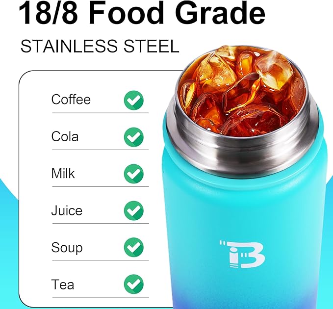 • DOUBLE WALL INSULATION: Our water bottle is made from high-quality 18/8 food-grade stainless steel, rust-proof, BPA-free, lead-free, and easy to wash. This wide mouth water bottle features double-walled vacuum insulation, which can keep your beverages cold for 24 hours and hot for 12 hours with a fresh taste. The wide mouth design is perfect for ice cubes and easy to clean.