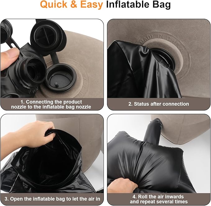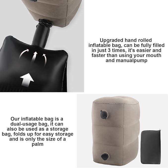 • 【Quick & Easy Inflatable Bag】Our upgraded travel inflatable foot rest pillow comes with a quick inflatable bag, which is very easy, fast and convenient, and can be fully filled in just 3 times, release the air only 3 or 5 seconds. It is faster than using your mouth and manual pump, also it takes away the hassle of bringing a pump and making noise in flight. This inflatable bag is a dual-usage bag, it can also be used as a storage bag, it is easily attached to your carry-on.