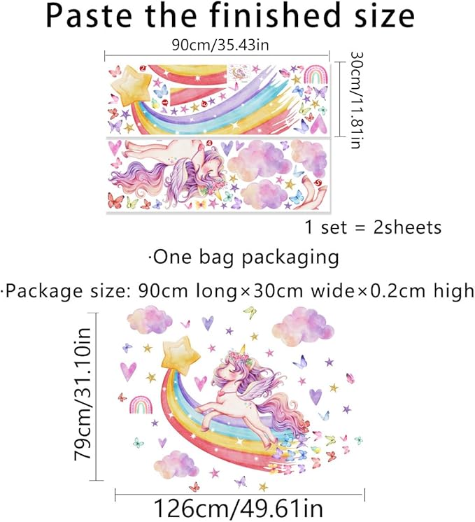 • Dimensions: Each unicorn decal measures approximately 12 inches (30.5 cm) tall, with varying sizes for the other elements.