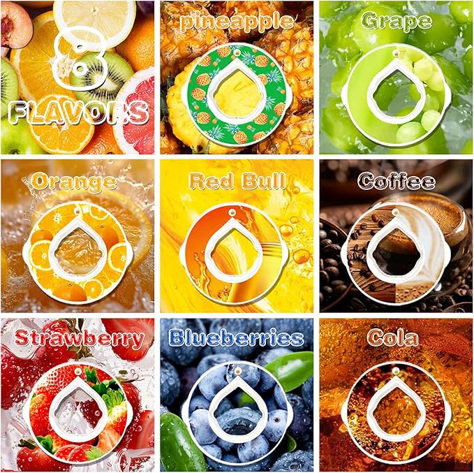 • 【ENJOYABLE FLAVOR VARIETY】Featuring 8 delightful aroma rings, including Orange, cola, rb, pineapple, green grapes, coffee, strawberry and bluebery,our air water bottle with fruit pods,Air water flavor pods give you a different sensory experience.Convenient and easy to use, these straw water bottles can be refilled multiple times, catering to your daily water intake and promoting a healthy lifestyle.