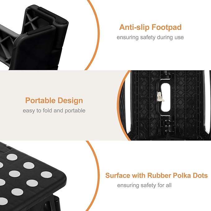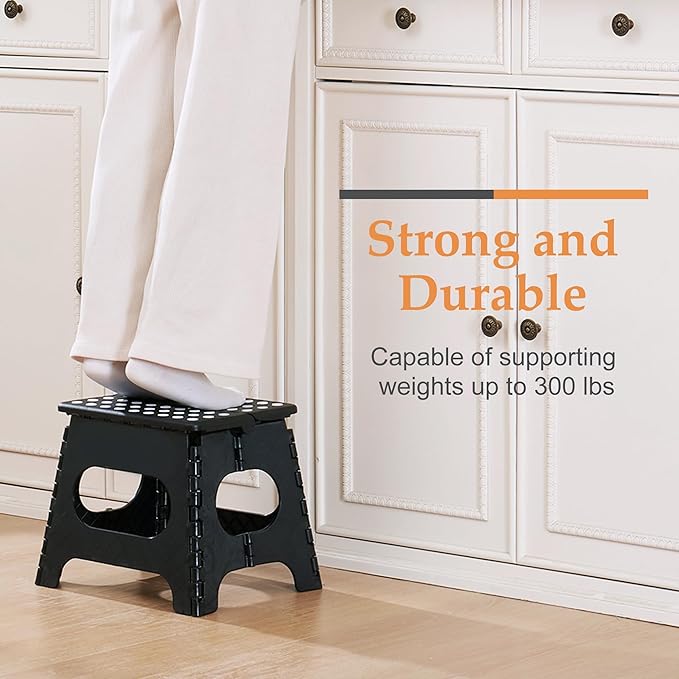 • Safety Design: Our foldable step stool for adults is equipped with a non-slip top and rubber bottom to prevent slips. Plus, this one step stool has a safety lock buckle to avoid accidental folding. With smooth rounded corners, the fold up stool keeps children safe from bumps.