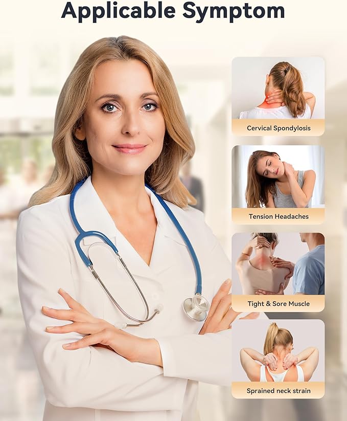 • Heated Neck Brace for Pain Relief :Our heated neck brace consists of a soft foam neck brace and a removable heating pad, when used together, it not only provides support, but its heating pad also generates heat and warms up the back of your neck to reduce joint stiffness, increase blood flow, and relieve the tightness of your neck after a long day's labor.