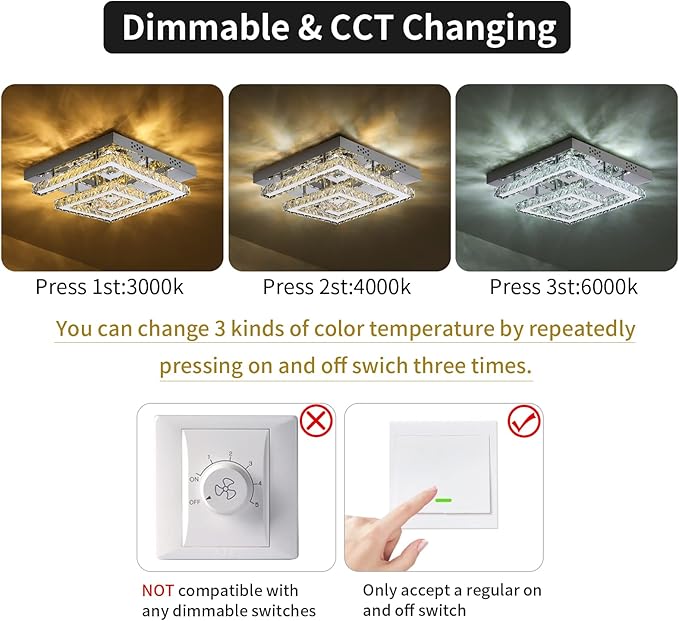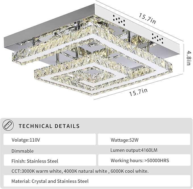 • 【DIMENSION】The overall size of the crystal flush mount lights is 16" x 16" x 4.8"H, Crystal Chandeliers height: 4.8", 2 Layers Led light source crystal light, Wattage: 33 W*3.