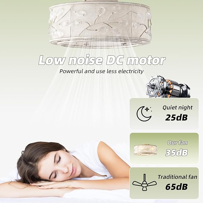 • Timing function, Intelligent control: We believe in understanding your life rhythm, so the white crystal ceiling fan with is also equipped with a timing function (1/2/4 hours). You can set the timer switch of the fan and light so that they work automatically when you need them. For example, the fan will automatically turn on in the afternoon of summer and easily turn off at night, providing you with a convenient and comfortable use experience.