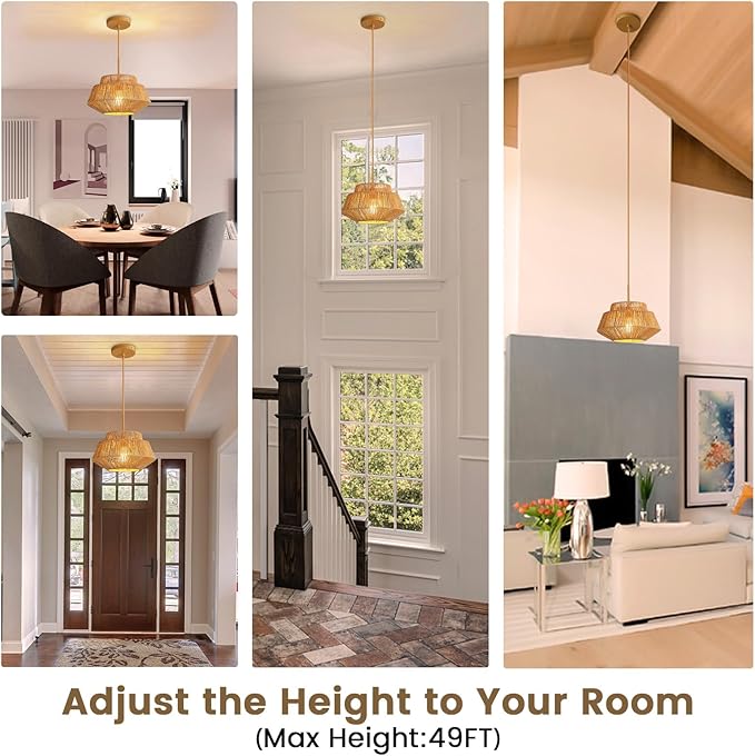 • Height Adjustable: The farmhouse chandelier ceiling light Width: is 10.1", Height: is 7.08", and you can adjust the hanging height of the rattan pendant light from 8.2" to 63.7" according to your preference and design. Available for flat or sloping ceilings. The modern chandelier can be compatible with dimmer switches and dimmable bulbs (the E26 bulb is NOT included)