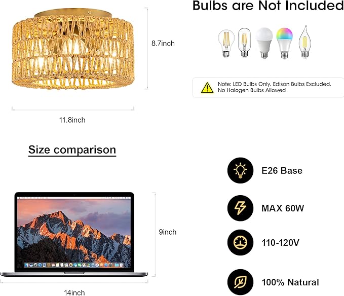 • Bulb Requirements: Rattan ceiling light fixture requires 3*E26 bulb (60W max, bulb not included).LED bulbs preferred. Compatible with LED, CFL, Incandescent.It is recommended to avoid Edison or Halogen bulbs. If you want a dimming effect, you will need dimmable bulbs and a dimmable switch (not included)