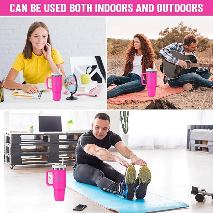 40oz stainless Steel Insulated Tumbler with Handle, lid and straw for cold water, Iced tea, or coffee - 100% Leak-Proof - Cupholder Friendly Travel Mug- Gifts for Women Men Him Her (Pink)